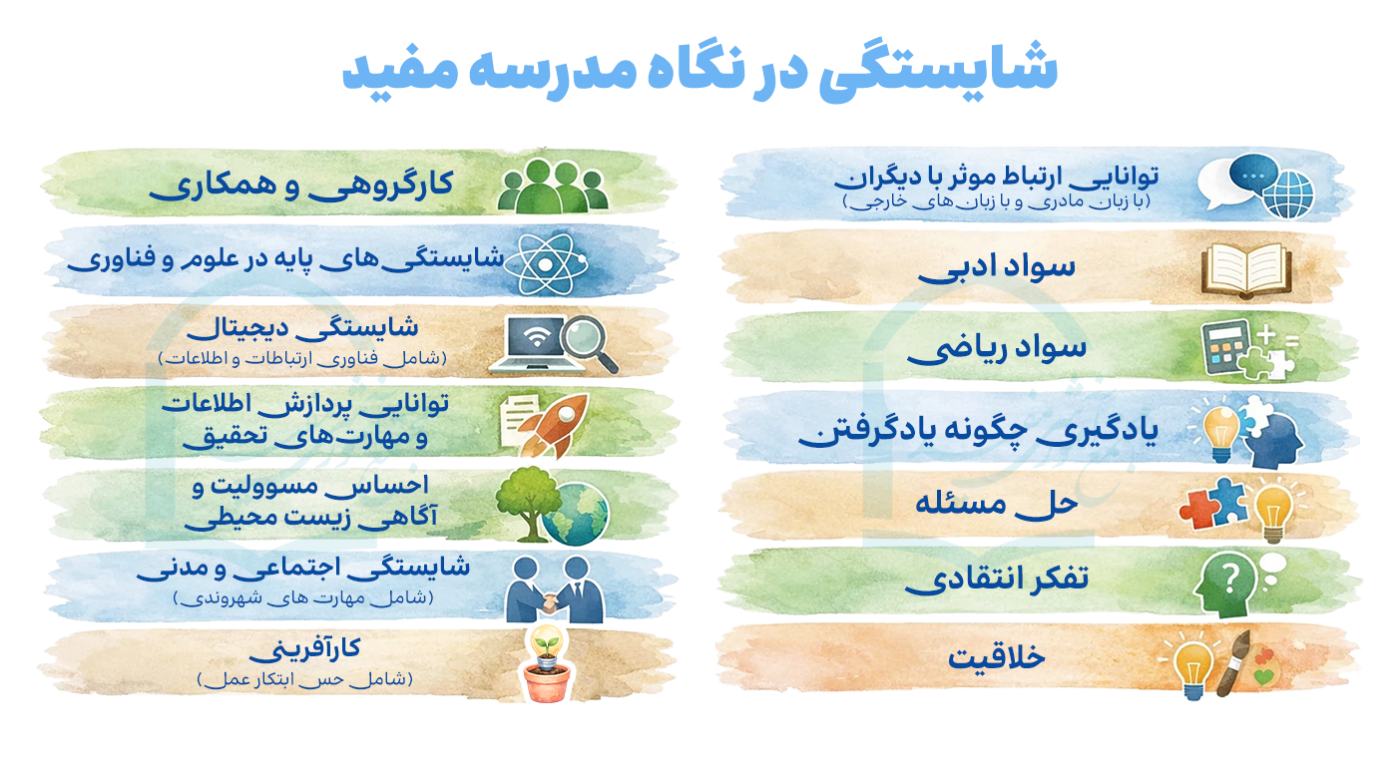 تحقق این شایستگی‌ها، ضرورت بازنگری در برنامه درسی مدرسه را به وجود می‌آورد. کاربردی کردن موضوعات درسی، تلفیق کردن موضوعات مختلف، استفاده از محیط‌های حقیقی و مجازی برای ارائه طرح درس‌ها و فراهم نمودن بستر مناسب برای فراگیران به طوری که با تجربه و پژوهش خود به هدف برنامه درسی برسند از جمله‌ی این ضرورت‌هاست.