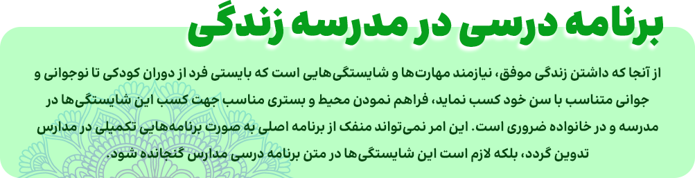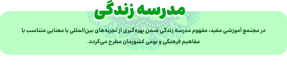 “مدرسه زندگی” فرصت و امکانی برای شکوفایی استعداها، رشد و تحقق بخشیدن به اهداف و آرزوهایی است که هر فرد را به تناسب تفاوت‌ها و نیازهایی که دارد آماده بهتر زیستن می‌کند. این مدرسه، ترجمان زندگی معنادار و نشاط آور می‌شود به گونه‌ای که نمی‌توان میان آموختن و زیستن تمایزی قائل شد.