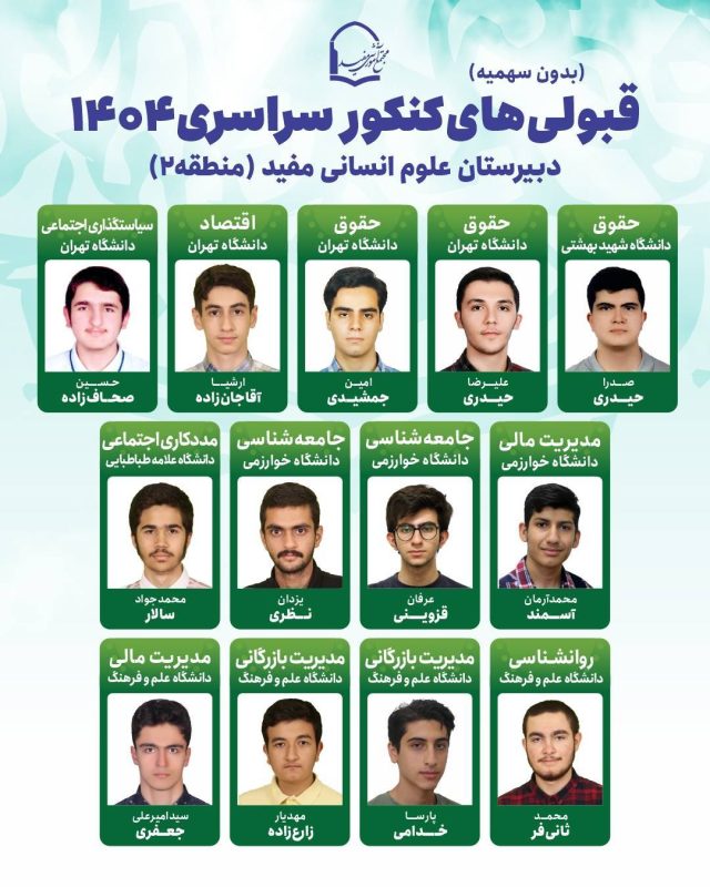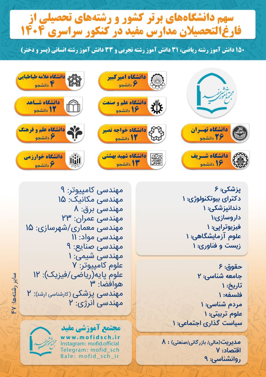 با نهایت افتخار و خوشحالی، قبولی دانشآموختگان عزیز مدارس مفید را در برترین دانشگاههای کشور تبریک میگوییم.