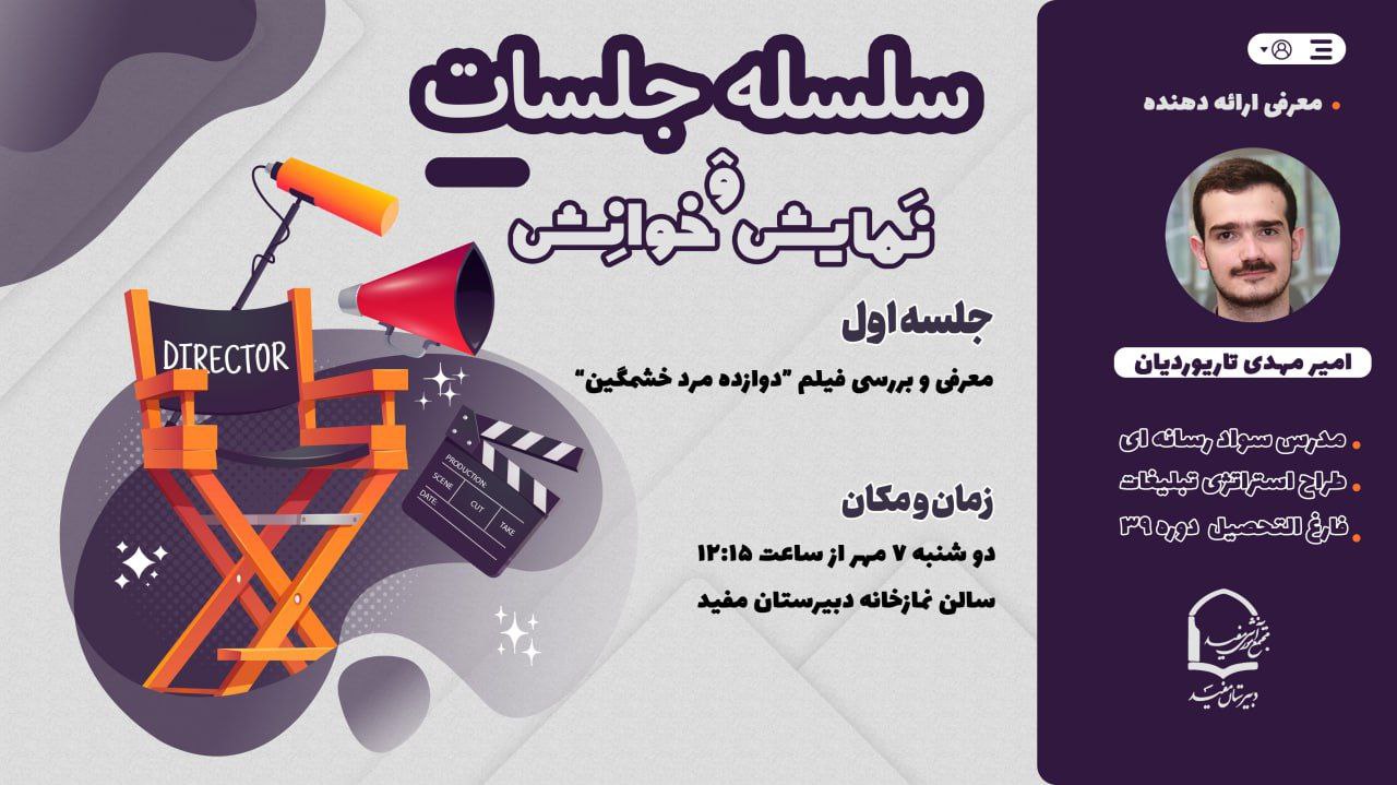 اولین جلسه از «سلسله جلسات نمایش و خوانش» روز دوشنبه ۷ مهرماه از ساعت ۱۲:۱۵ با موضوع فیلم «۱۲ مرد خشمگین» و ارائه «جناب آقای امیرمهدی تاریوردیان» برگزار گردید.