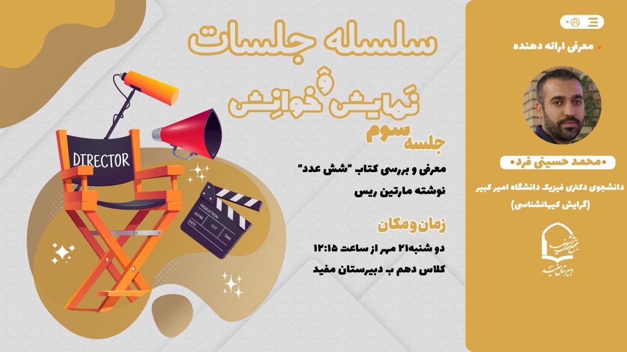 سومین جلسه از «سلسله جلسات نمایش و خوانش» روز دوشنبه ۲۱ مهرماه از ساعت ۱۲:۱۵ با موضوع کتاب «شش عدد» نوشته مارتین ریس و ارائه «جناب آقای محمد حسینفرد» برگزار گردید.