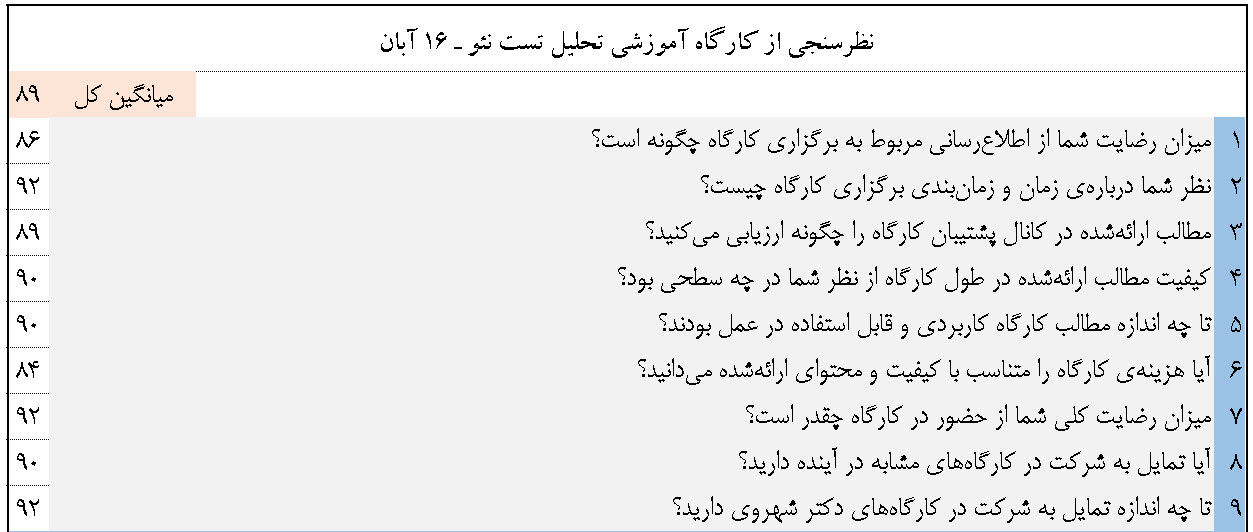 کارگاه تکمیلی آزمون شخصیت نئو با حضور ثبتنام کنندگان صبح تا ظهر روز جمعه ۱۶ آبان توسط دکتر شهروی برگزار گردید.