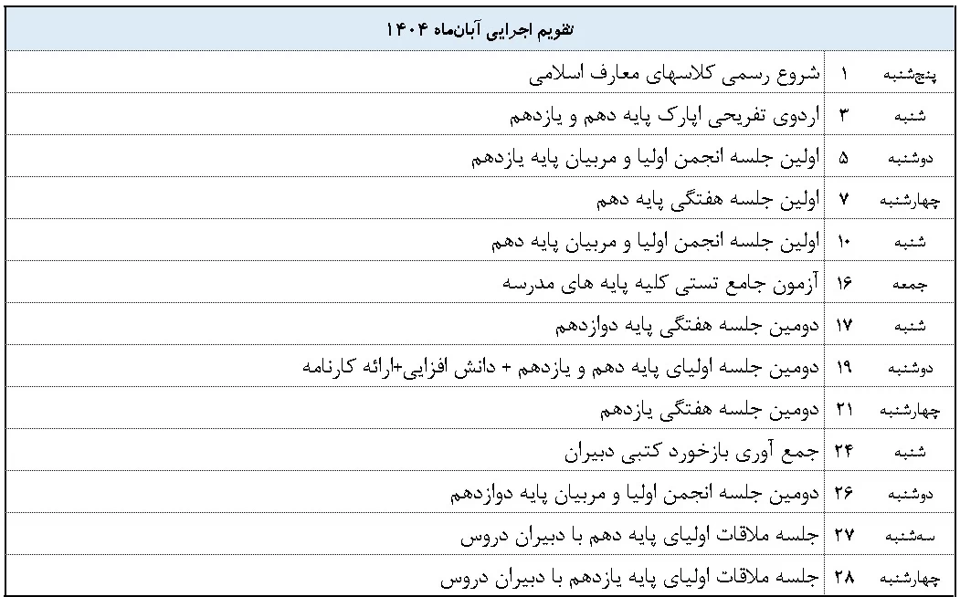 تقویم برنامه‌های ماهانه دبیرستان مفید قیطریه