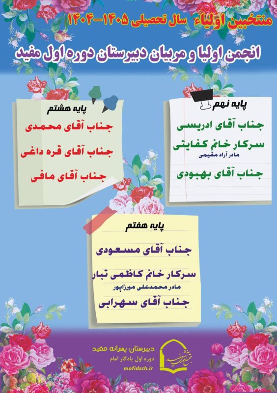 🗳 با شمارش آرایی که در جلسهی معارفهی ابتدای سال سه پایه از اولیای محترم اخذ شد، نتایج نهایی انتخابات انجمن اولیا مربیان پایههای هفتم، هشتم و نهم برای سال تحصیلی ۰۵-۱۴۰۴ مشخص شد.
