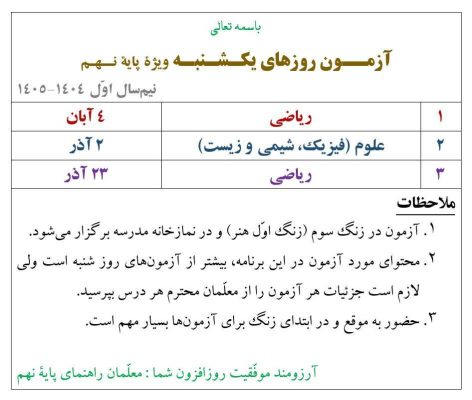 برنامۀ آزمونهای یکشنبه نیمسال اوّل پایه نهم 04 آبان ✅ *اطلاعیه * سلام بر همۀ دوستان به پیوست برنامۀ آزمونهای یکشنبه نیمسال اوّل تقدیم حضورتان میشود. امیدوارم با تلاشی پویا و پایدار بسیار موفّق باشید. 🏢 مسئول پایه نهم (جناب آقای قرائی) ☎️+۹۸۲۱۶۶۰۵۳۹۳۹ 🆔 @mofid1m2