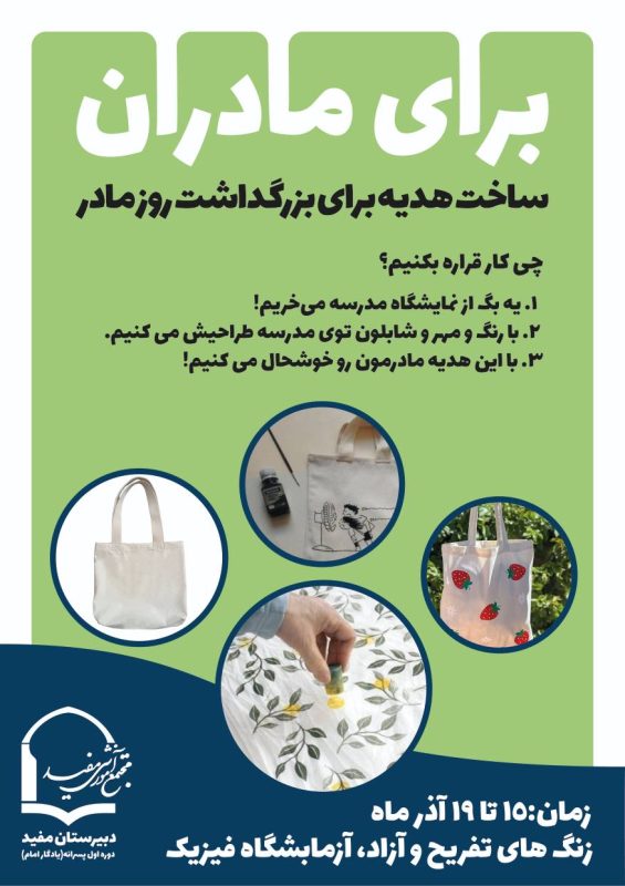 🔸 هر دانش‌آموز امکان انتخاب یک کیف و رنگ‌آمیزی و نقاشی روی آن را دارد تا آن را به مادر خود هدیه دهد!