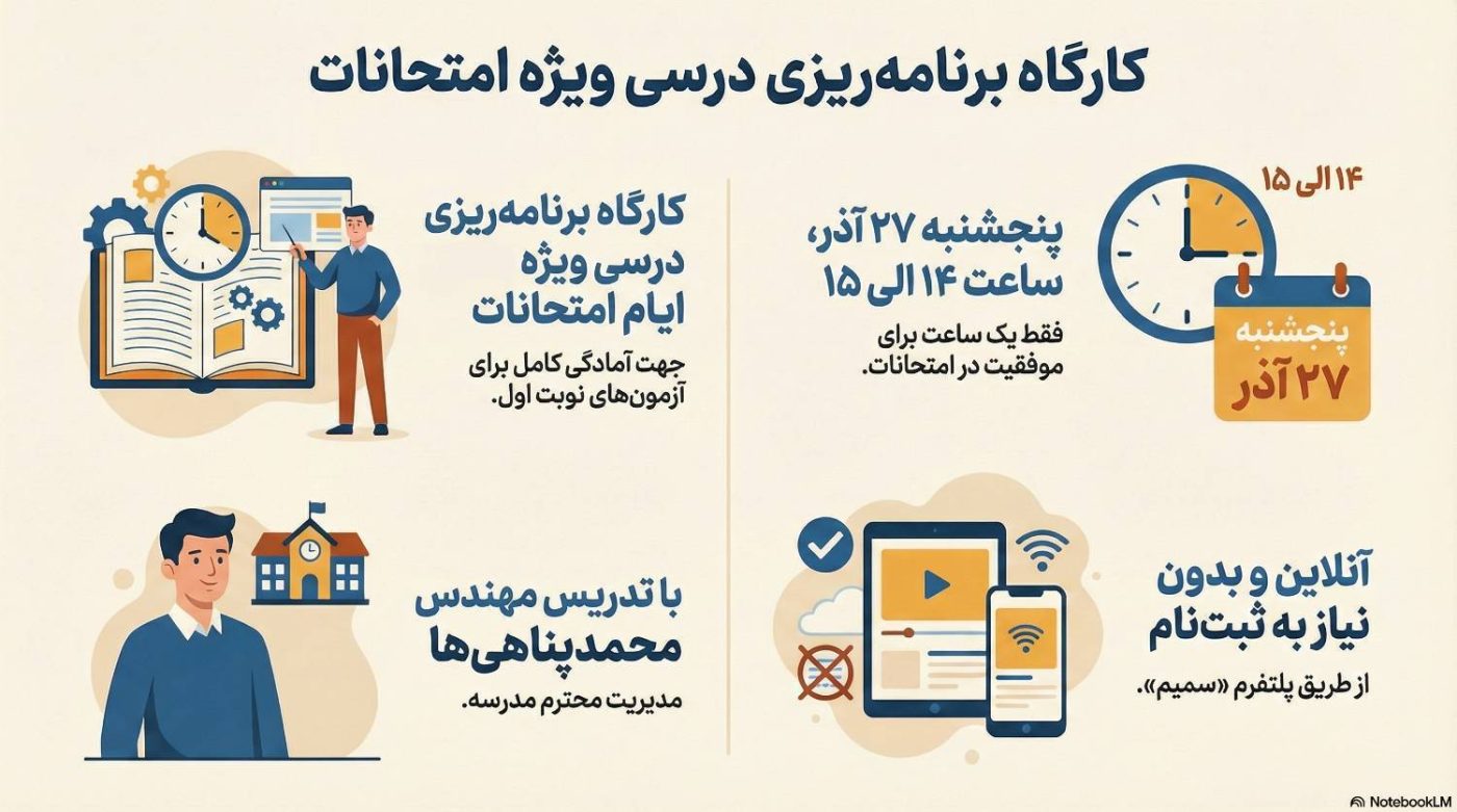 * امروز پنجشنبه ۲۷ آذر ساعت ۱۴ الی ۱۵ براش کارگاه داریم و در این کارگاه جناب آقای محمدپناهی ها مدیریت محترم مدرسه بهتون آموزش میدن که چطور برای ایام امتحانات برنامه ریزی کنید.