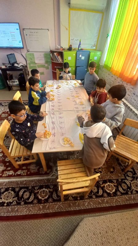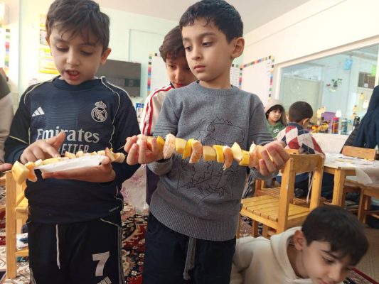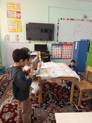 ریاضی در بخش آموزش ریاضی همچنان طرح جمع با فعالیتهای گوناگون جمعهای ترکیبی ، اسلاید تساوی ، محور ، قاب های پنجرهای ، قاب دهتایی و مجهول یابی و حل مسئله ادامه یافت و به روشهای حل مسئله و رسیدن به پاسخ گفتگوهایی انجام شد.همچنین طرح الگو و اشکال هندسی با دیدن تصاویر مختلف الگو دار آغاز و با فعالیت آماده کردن یک سیخ میوه الگو دار ادامه یافت.